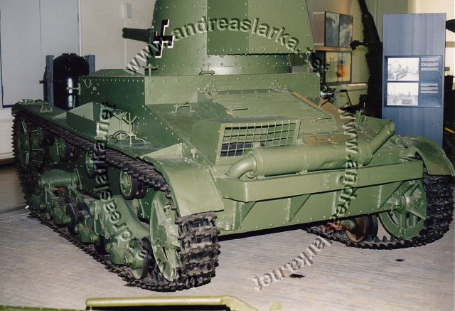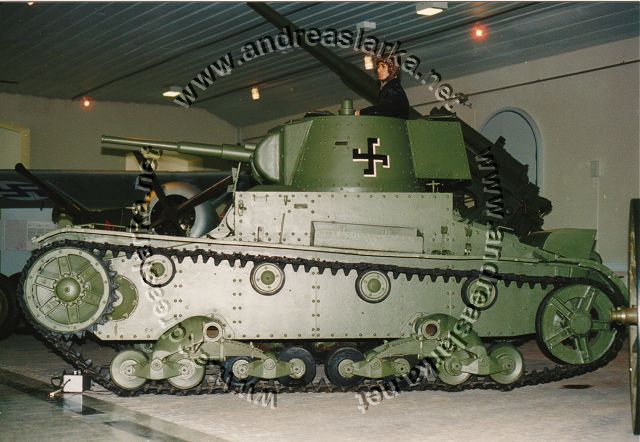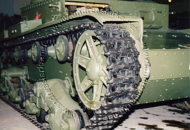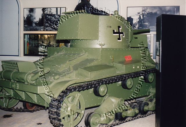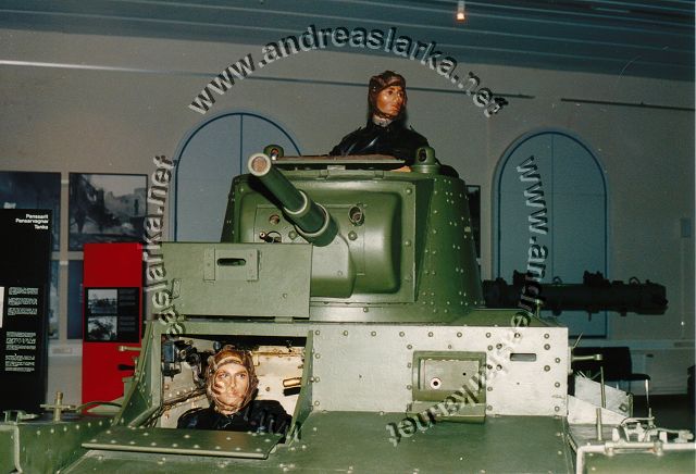 |   This Vickers is modified with a Soviet 45mm gun, new optics etc. making it into a T-26E. Used by the Finnish armoured forces in The Continuation War 1941 - 1944. These pictures are taken at the Suomenlinna War Museum in Helsinki, Finland. Photos and text © Copyright by Andreas Lärka, Finland. |