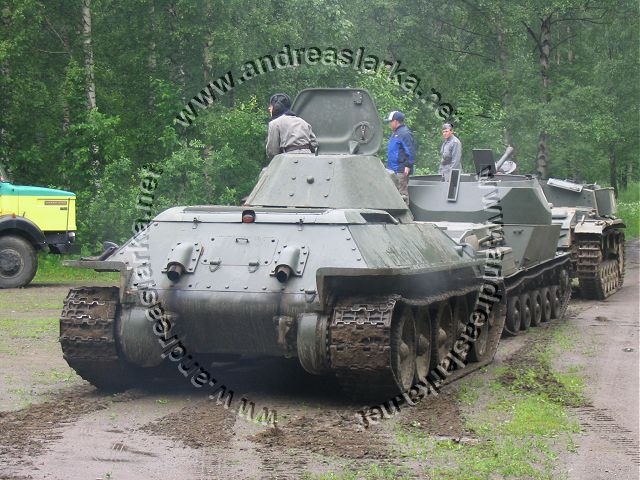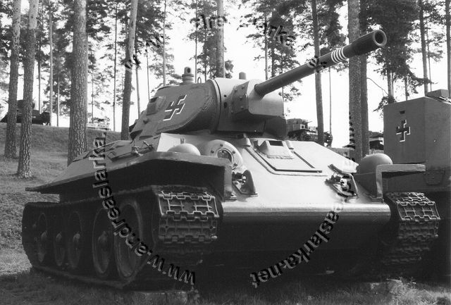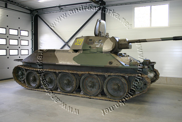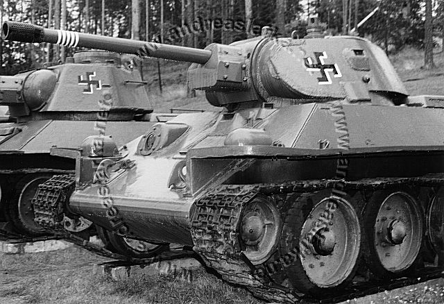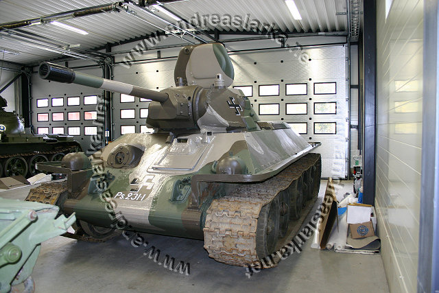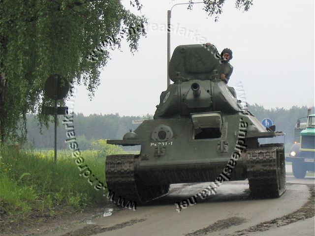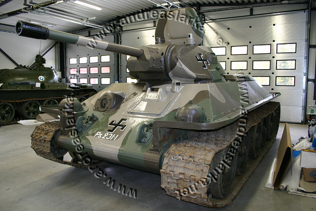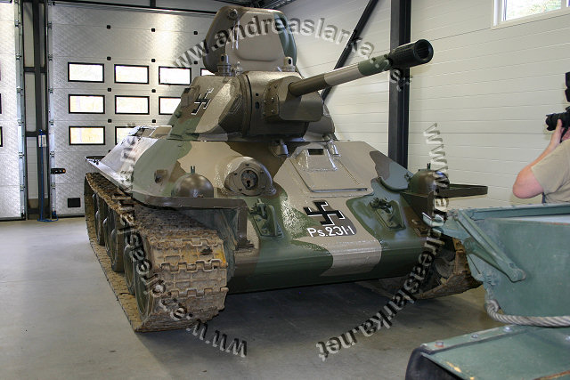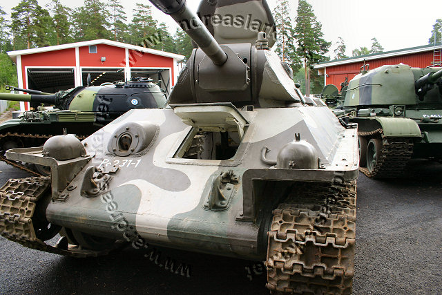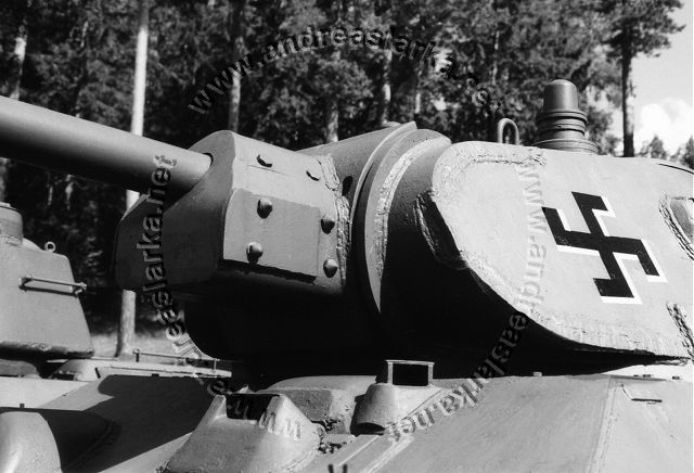This tank was captured in the year of 1943. At the time of it's capture and when in Finnish service the second and fourth wheels on both sides were of the all steel wheel -type. It also had the early type of tracks. See the wartime picture above. It is the very first Finnish T-34 to receive the new Ps. -registration number. Restored to running condition. These pictures are taken at the Parola Armour Museum in October 2008 during the re-painting of the tank into the original colour-scheme and markings. Please note that the colours are freshly painted and therefore a bit glossy. When dry the colours should be completely matt. Photos and text © Copyright by Andreas Lärka, Finland.