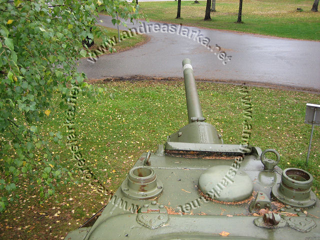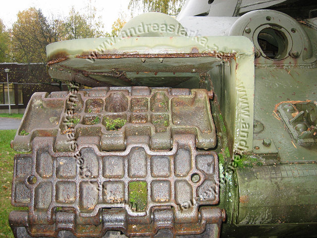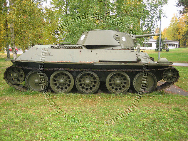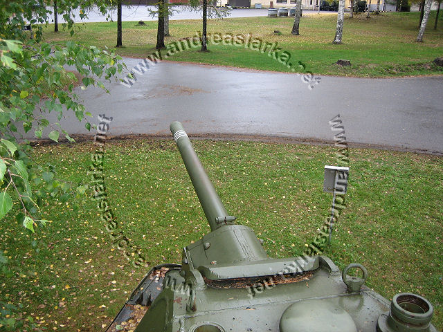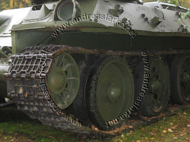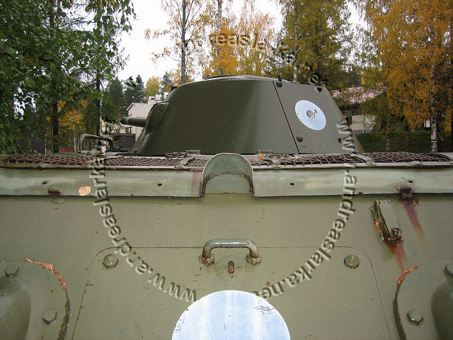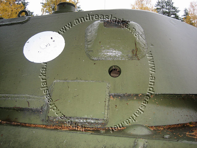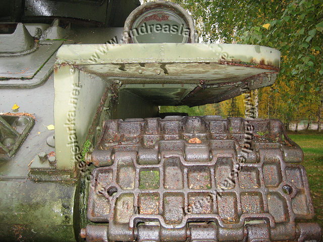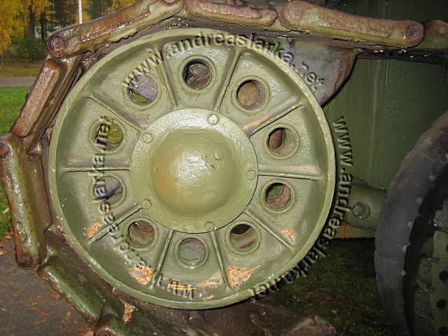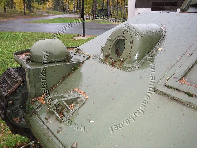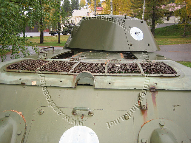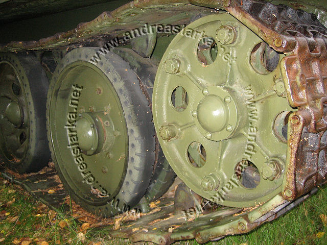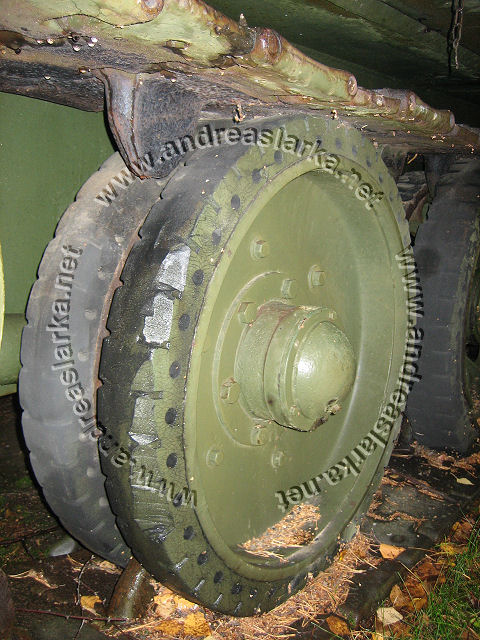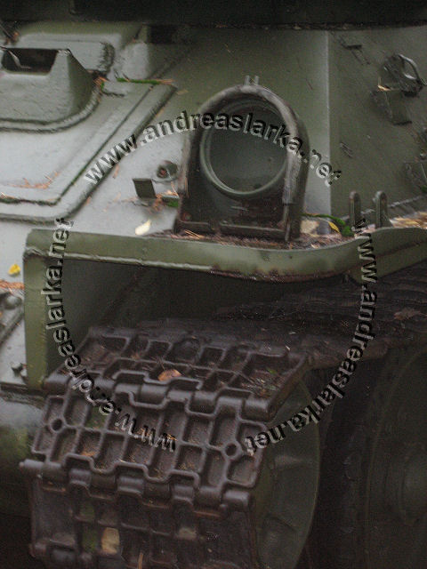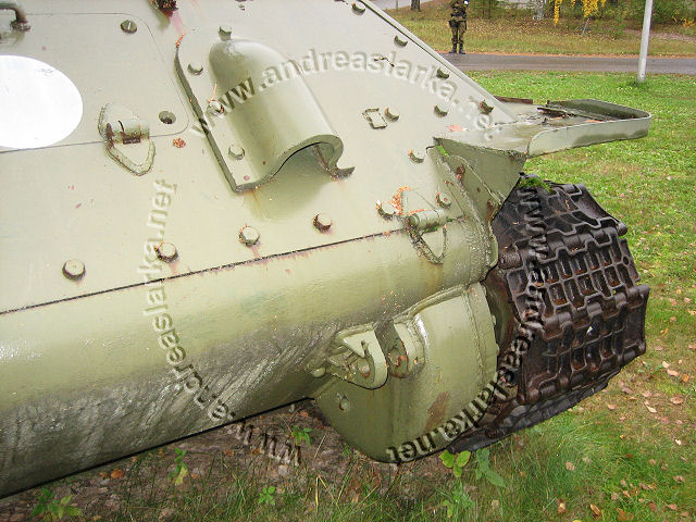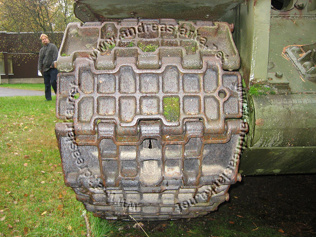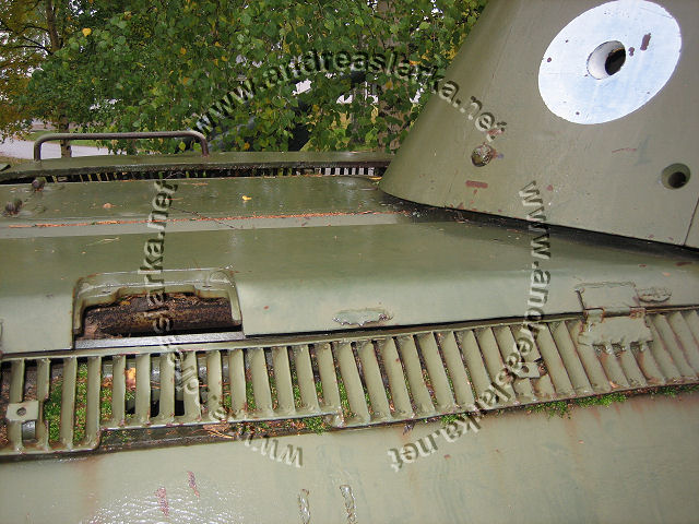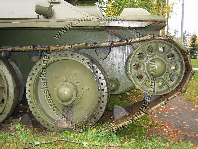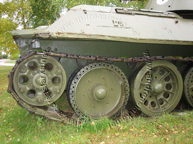 The tank is in it's post-war condition. The roadwheels, idler-wheels and the tracks have been changed. During the war the roadwheels were of the solid dish type, and the idler-wheels were the typical m1941 rubber-rimmed ones. The tracks were of the pre-1942 kinds. Also the front- and aft fenders have been modified. During the war these were of the same kind as Ps.231-2 still have today.