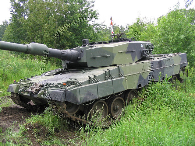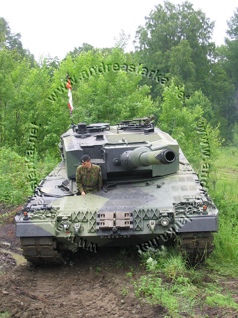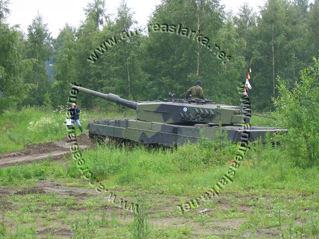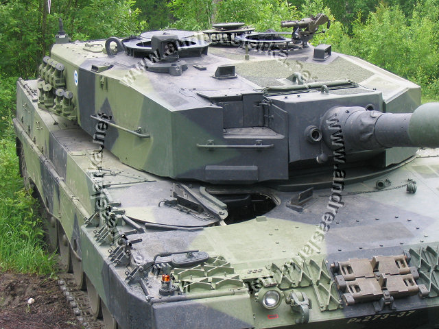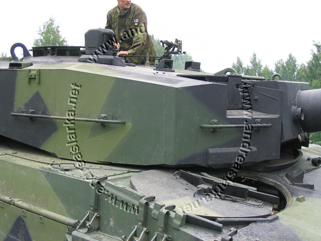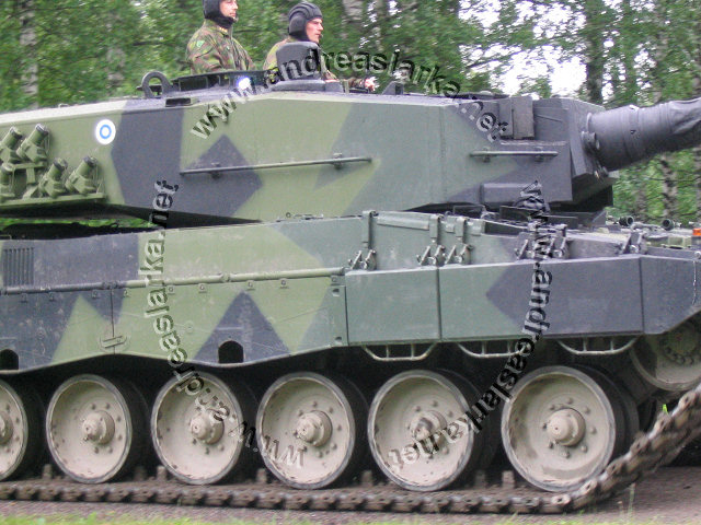 ![]() This Leopard 2 A4 has the correct Finnish three-tone-camoflage, the smaller outside modifications are done, but the more visible ones (turret handrails and boxes etc.) are still missing. Note the Finnish made cut-out for the drive-sprocket. These pictures are taken on June 28th 2004 outside the Finnish Armoured Brigade in Parola, Finland. Photos and text © Copyright by Andreas Lärka, Finland. Thanks to Mr. Esa Muikku for supplying correct info about the Finnish mods.