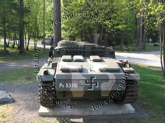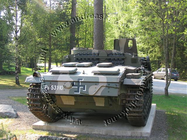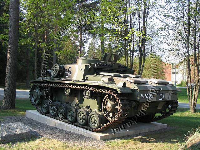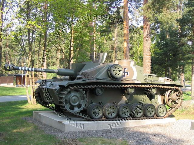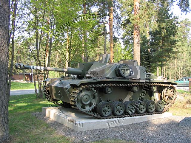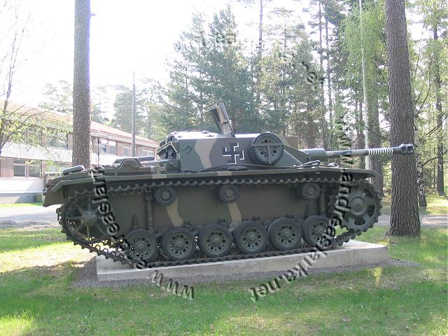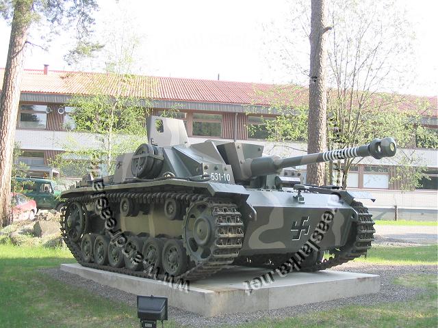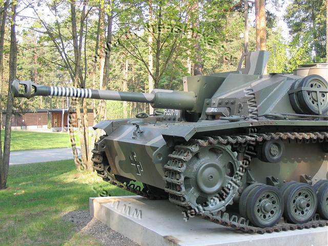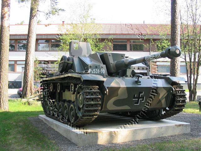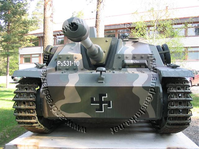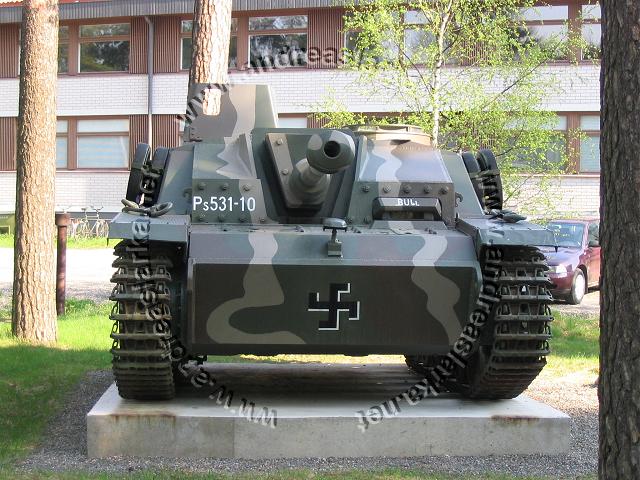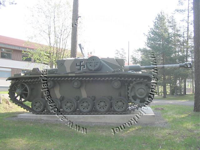 ![]() This Alkett-built StuG with it's crew (commander Börje Brotell, gunner Olli Soimala, driver Sulo Kauppi and loader Armas Launikko) is the one that scored the most victories during the hard fighting in the summer of 1944. With 11 confirmed tank-kills this StuG now stands as a monument at the Finnish Armoured Brigades garrison area in Parola, Finland. This StuG is restored to almost war-time condition. The colours are authentic (the same as the ones used on Ps.531-8 "Aili") and the colour-scheme has been restored. These pictures are taken at the Finnish Armoured Brigade's garrison in Parola, Finland. Photos and text © Copyright by Andreas Lärka, Finland.