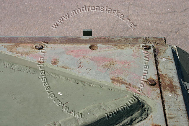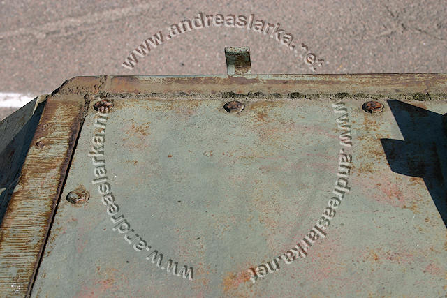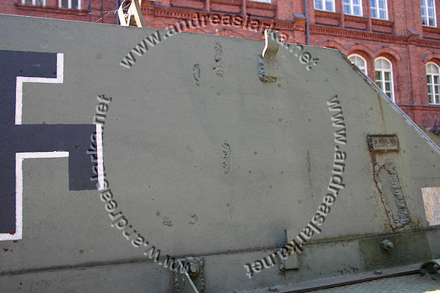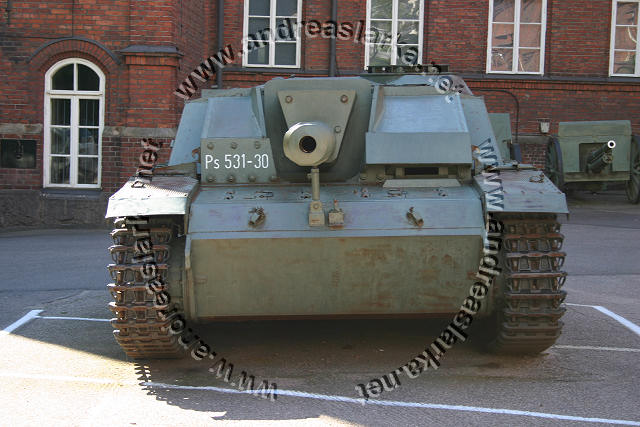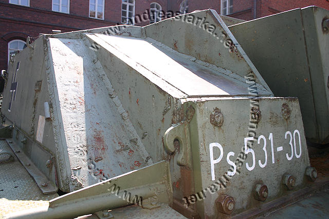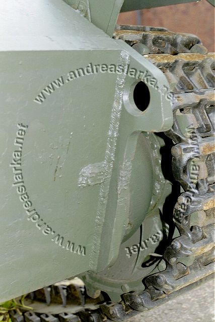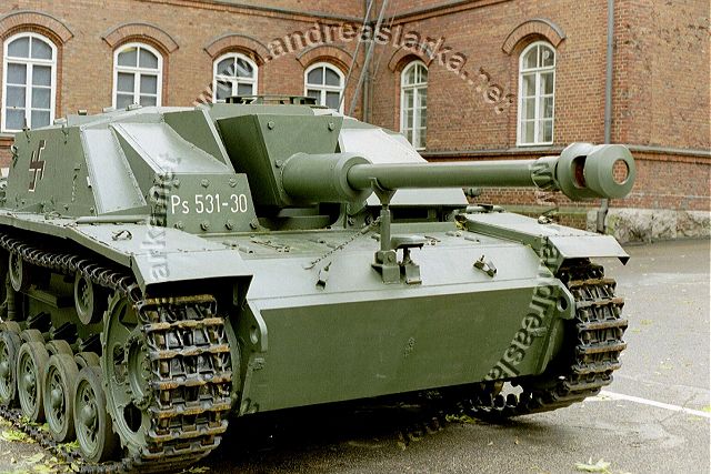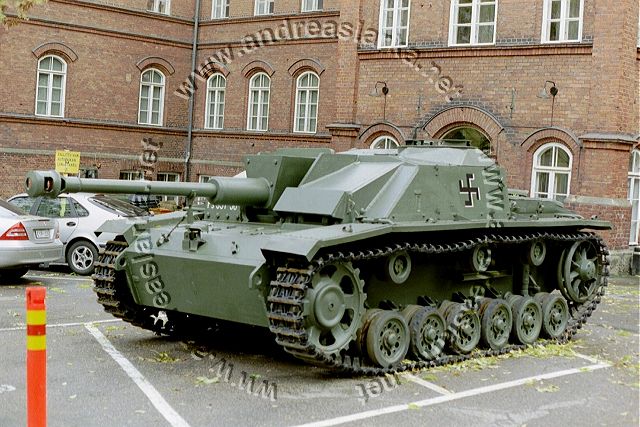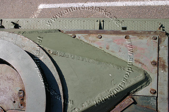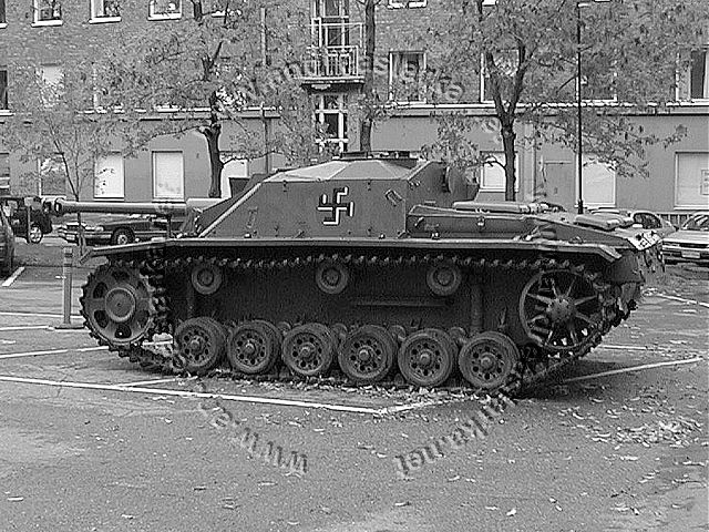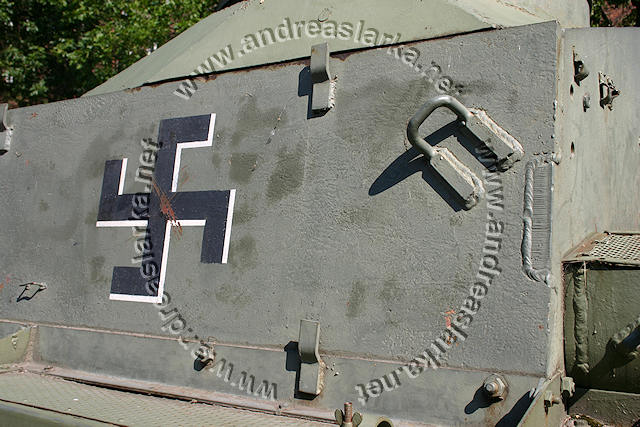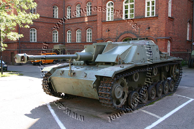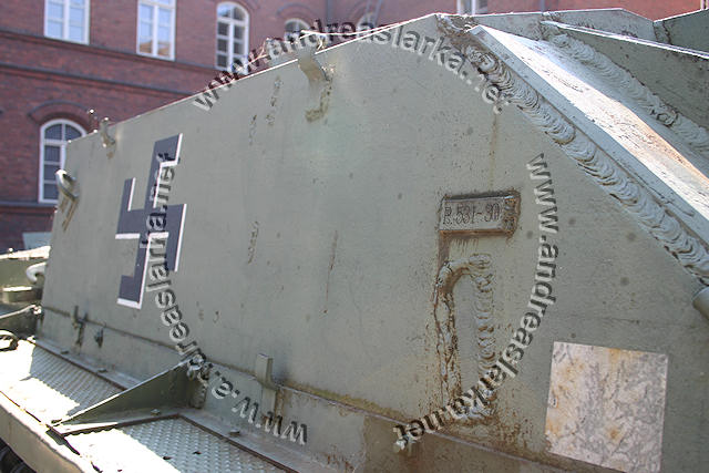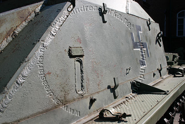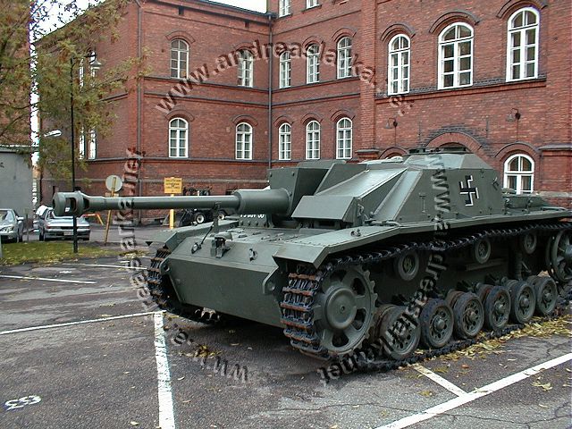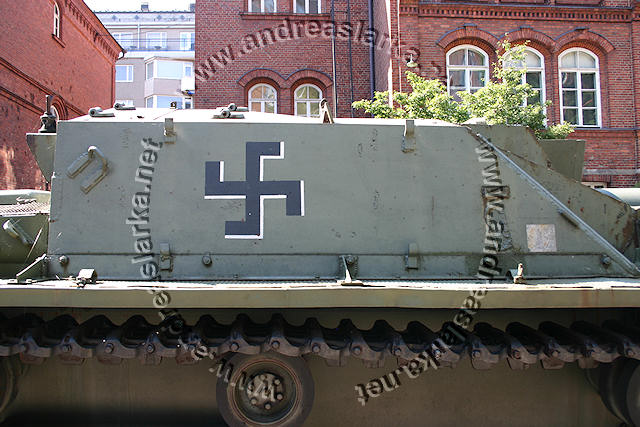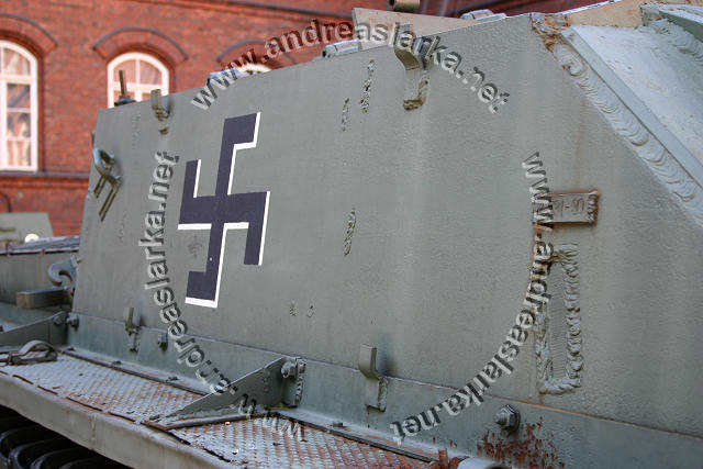 This tank is the very last of the 1943 batch of StuG's that arrived to Finland. The tank is a production mish-mash with a late interlocked-welded substructure and an earlier "straight-welded" superstructure. The vehicle was produced in the fall of 1943. During the war this vehicle served as a training vehicle. It did not have it's spare wheels moved to the sides of the fighting compartments as Finnish Sturmis typically have. It sports the Finnish made deflector for the commander's cupola and remains of extra armour in front of the loader.