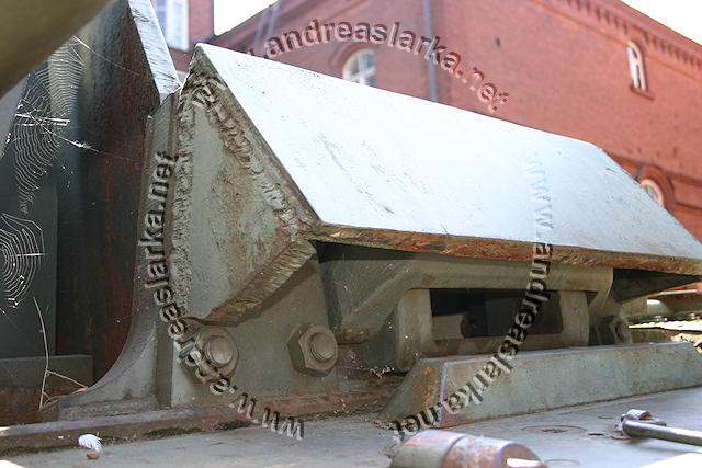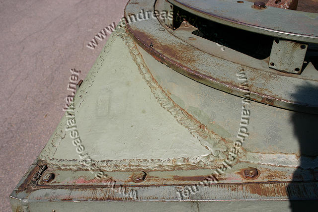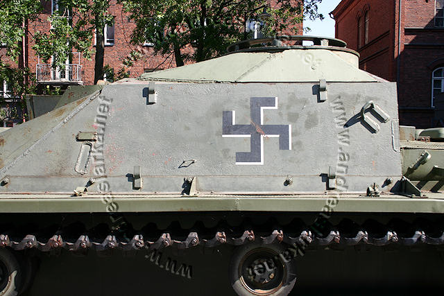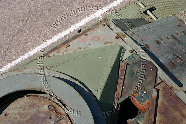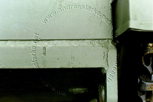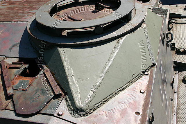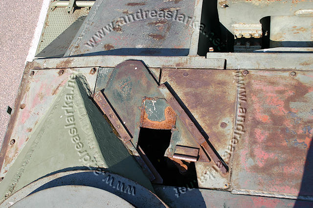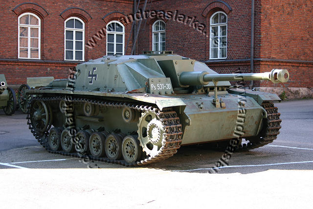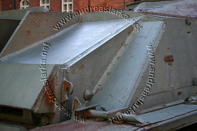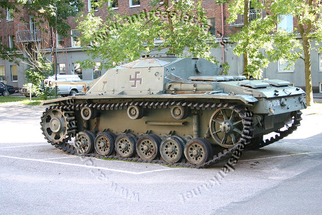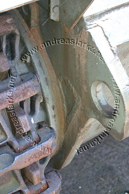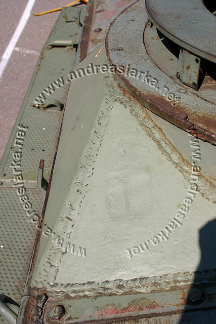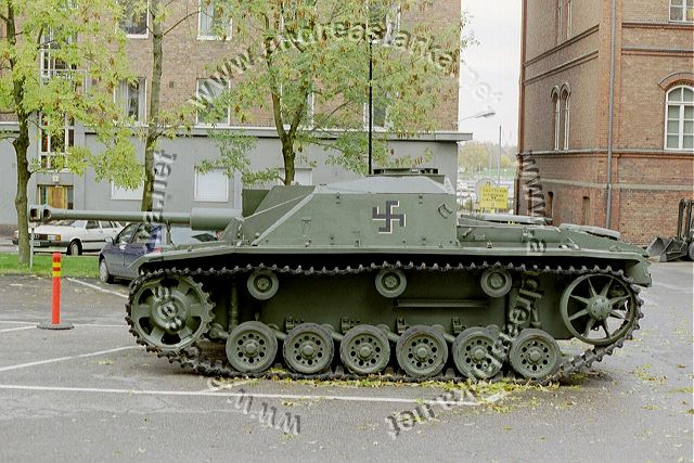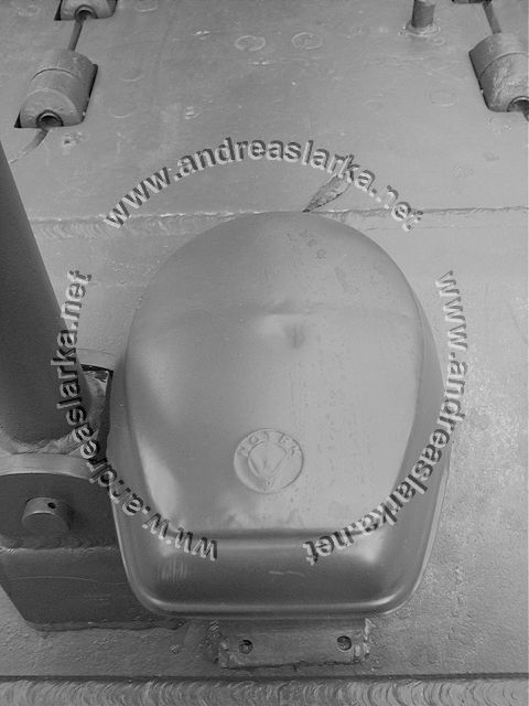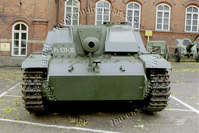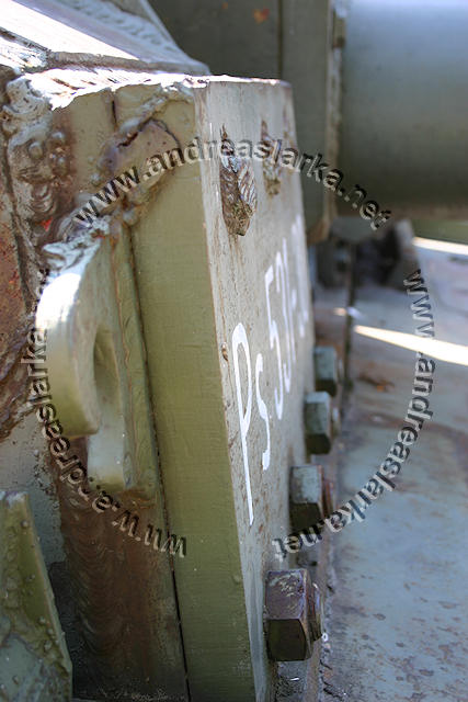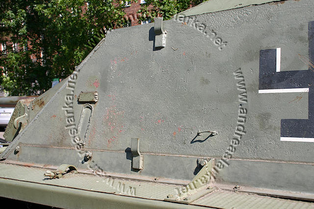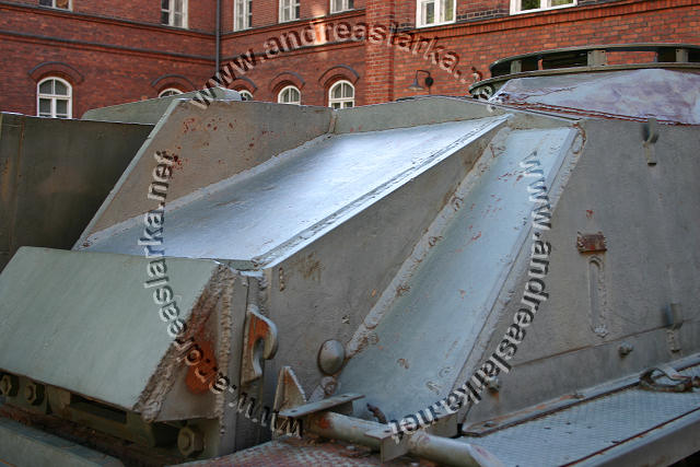 This tank is the very last of the 1943 batch of StuG's that arrived to Finland. The tank is a production mish-mash with a late interlocked-welded substructure and an earlier "straight-welded" superstructure. The vehicle was produced in the fall of 1943. During the war this vehicle served as a training vehicle. It did not have it's spare wheels moved to the sides of the fighting compartments as Finnish Sturmis typically have. It sports the Finnish made deflector for the commander's cupola and remains of extra armour in front of the loader.