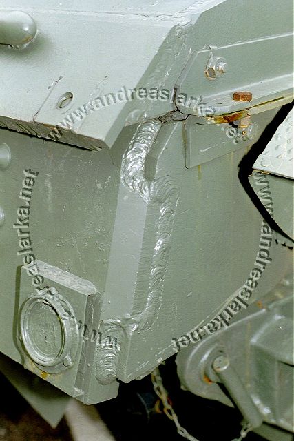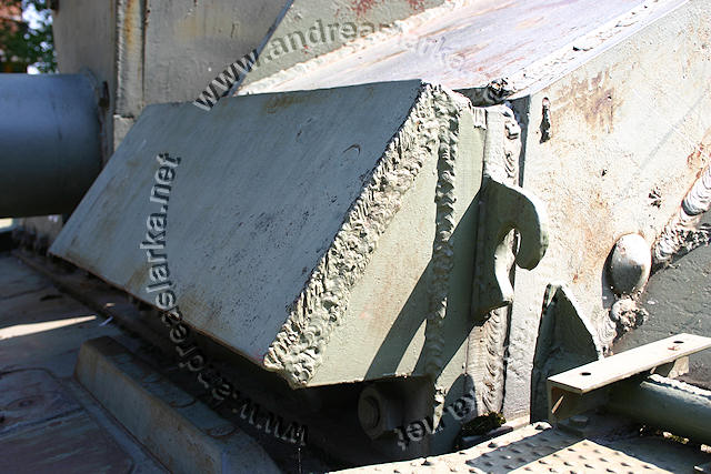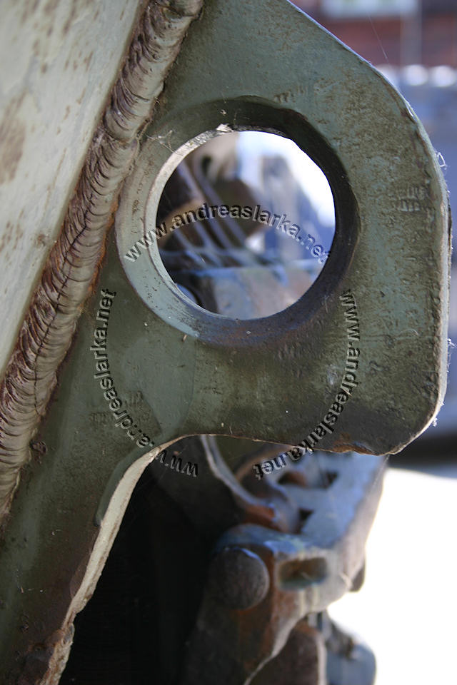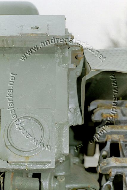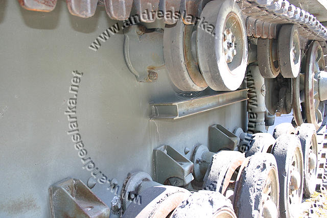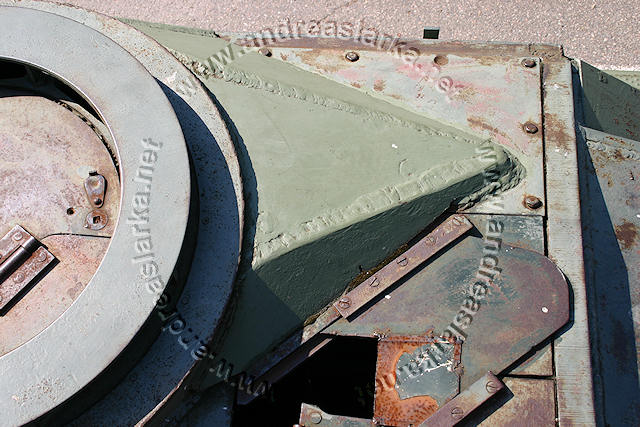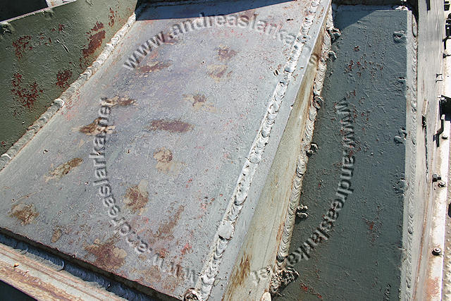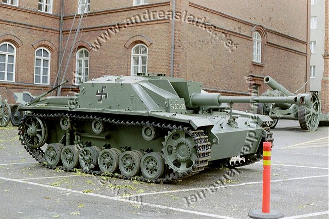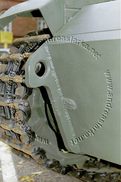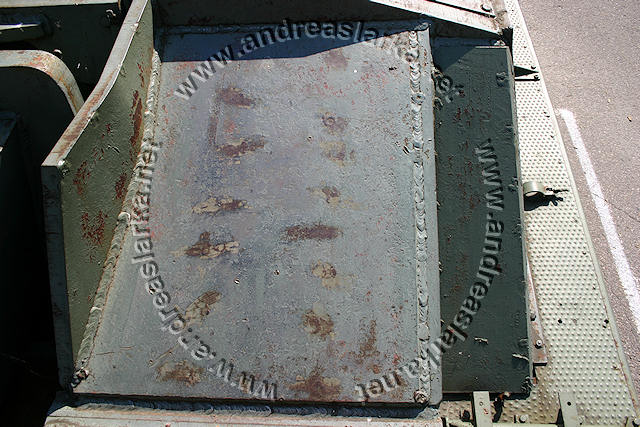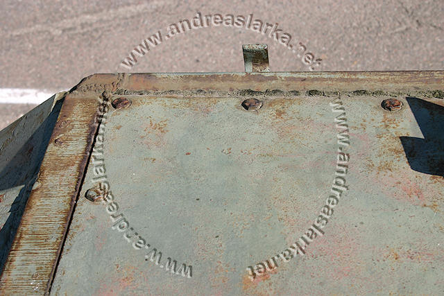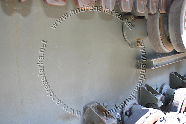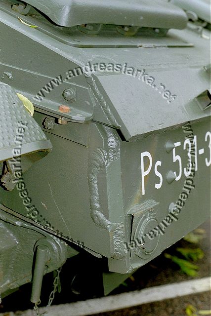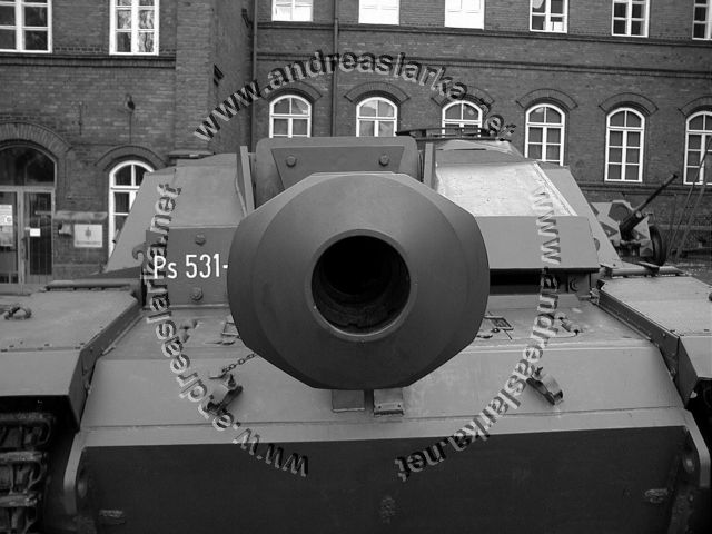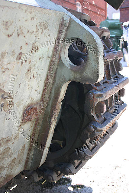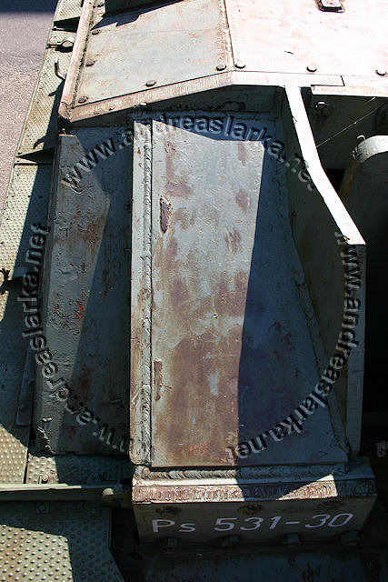 This tank is the very last of the 1943 batch of StuG's that arrived to Finland. The tank is a production mish-mash with a late interlocked-welded substructure and an earlier "straight-welded" superstructure. The vehicle was produced in the fall of 1943. During the war this vehicle served as a training vehicle. It did not have it's spare wheels moved to the sides of the fighting compartments as Finnish Sturmis typically have. It sports the Finnish made deflector for the commander's cupola and remains of extra armour in front of the loader.