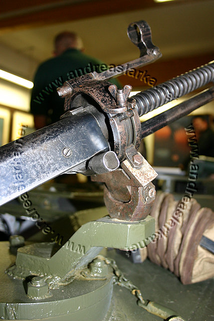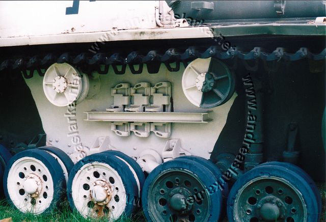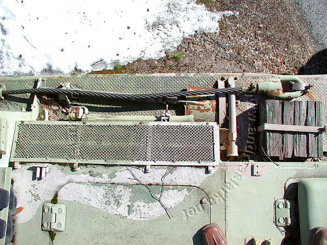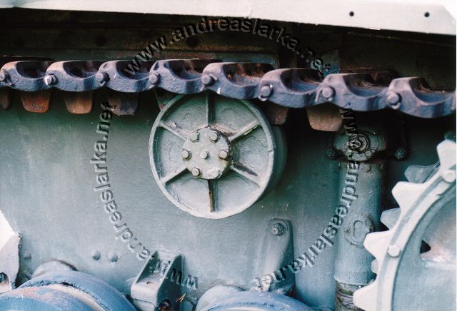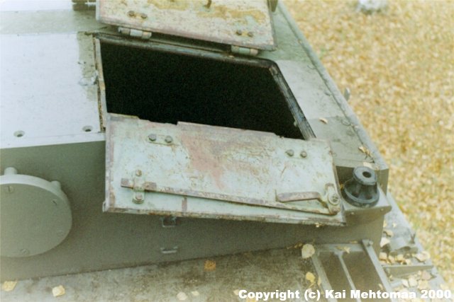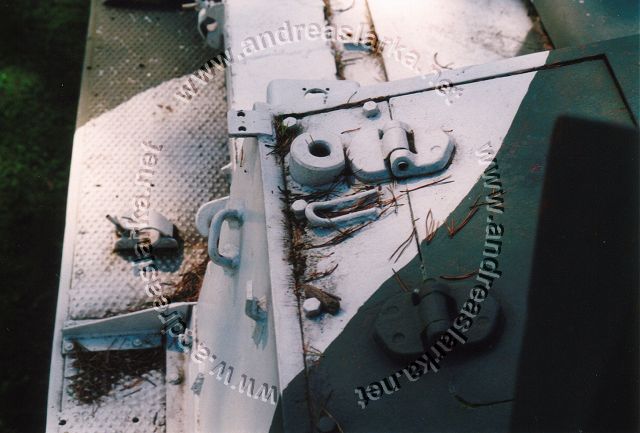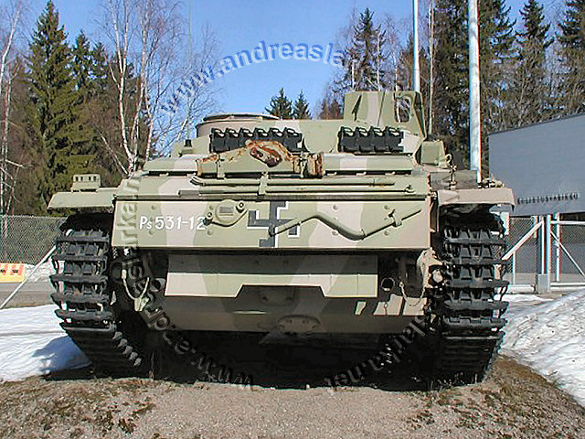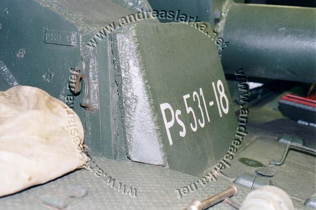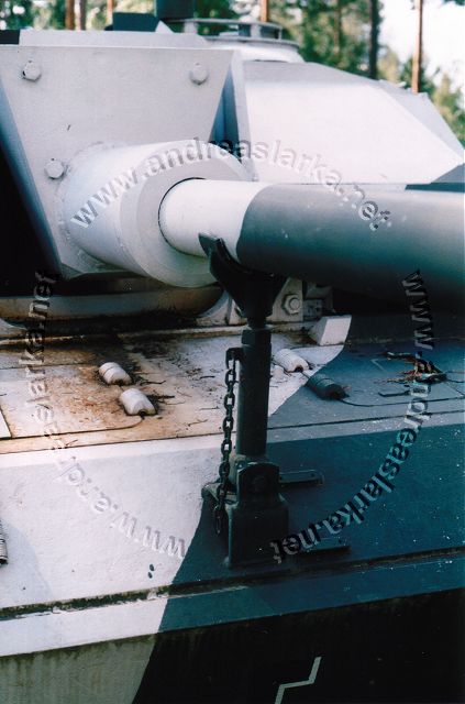 Modifications during 1943 and early 1944 Between the arrival of the 1943 batch StuGs at the Panssarikeskus ("Tank-Center") in Varkaus and their first "official appearance" in Enso (Svetogorsk) June 4th 1944 the following changes had been made: The German MG 34 was changed into the Russian DT tank-machinegun and the crew's MP 40 sub-machinegun was changed into the Suomi sub-machinegun. The loader's shield had to be modified with a larger hole and a different stand for the DT tank-machinegun. The protective shields on the sides, "Schurzen", were removed. Apparently because they were deemed impractical. During the spring of 1944 the spare roadwheels on most vehicles were moved from their original place at the rear of the tank and placed on the sides of the fighting compartment. At the same time a large wooden stowage box was put on the rear of the tank where the sparewheels used to be3). The split-lid box had a large (Soviet type, often seen on the T-34) saw attached to the front of it, and one grab handle per side. The stowage box was held in place by metal racks, sort of a shortened version of the German stowage racks. The start-crank was moved to the rear of the tank. In Varkaus the StuG's also got their tank numbers4) painted to the front and the rear of the vehicles and also punched into a small metal plate on the sides of the fighting compartment. As national markings the Finnish tank-swastika was painted on both sides of the fighting compartment, on the rear and front armourplates and on top of the gun-mantlet. The swastika on top of the gun-mantlet was probably painted from the front, i.e. the swastika was facing the front of the vehicle.